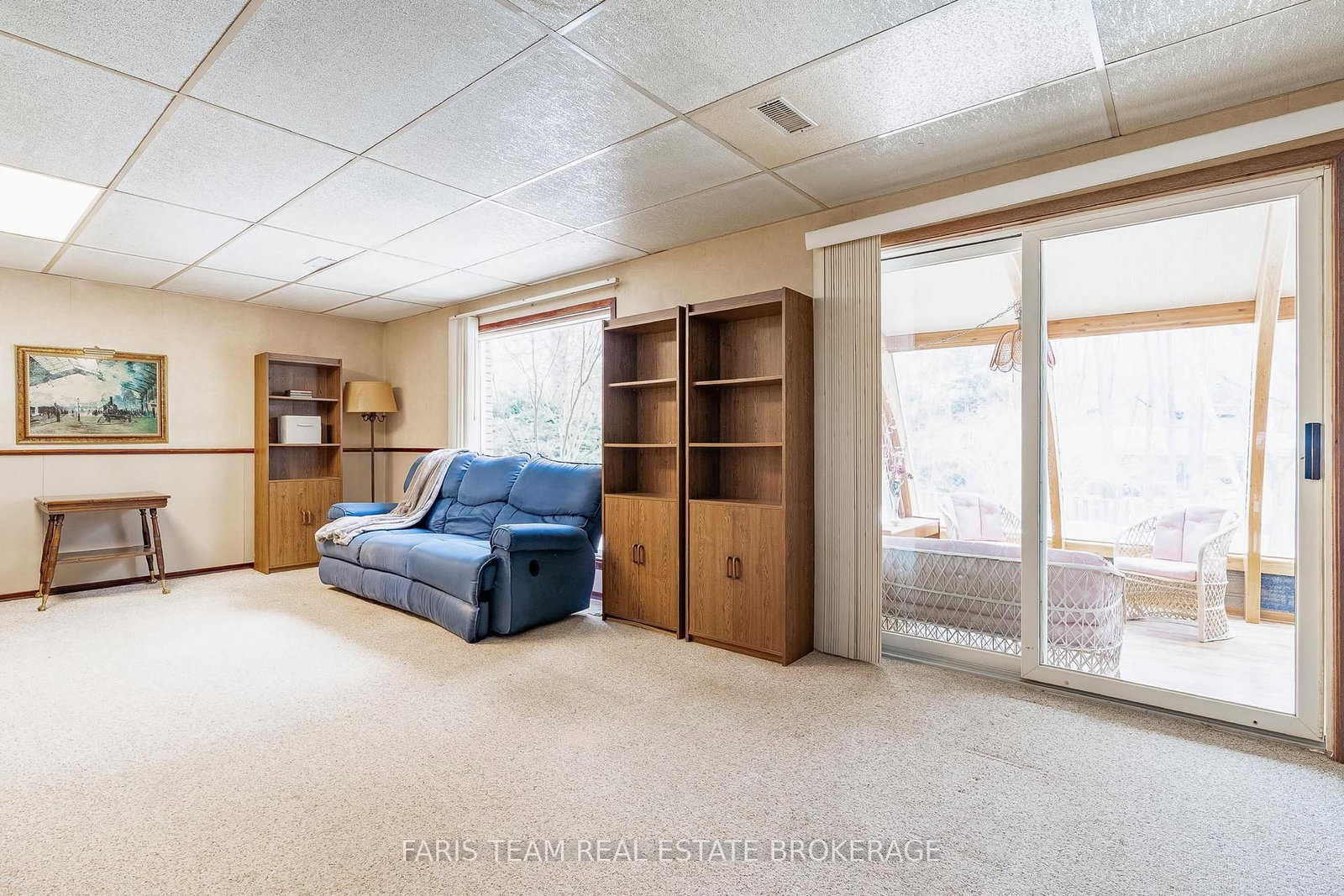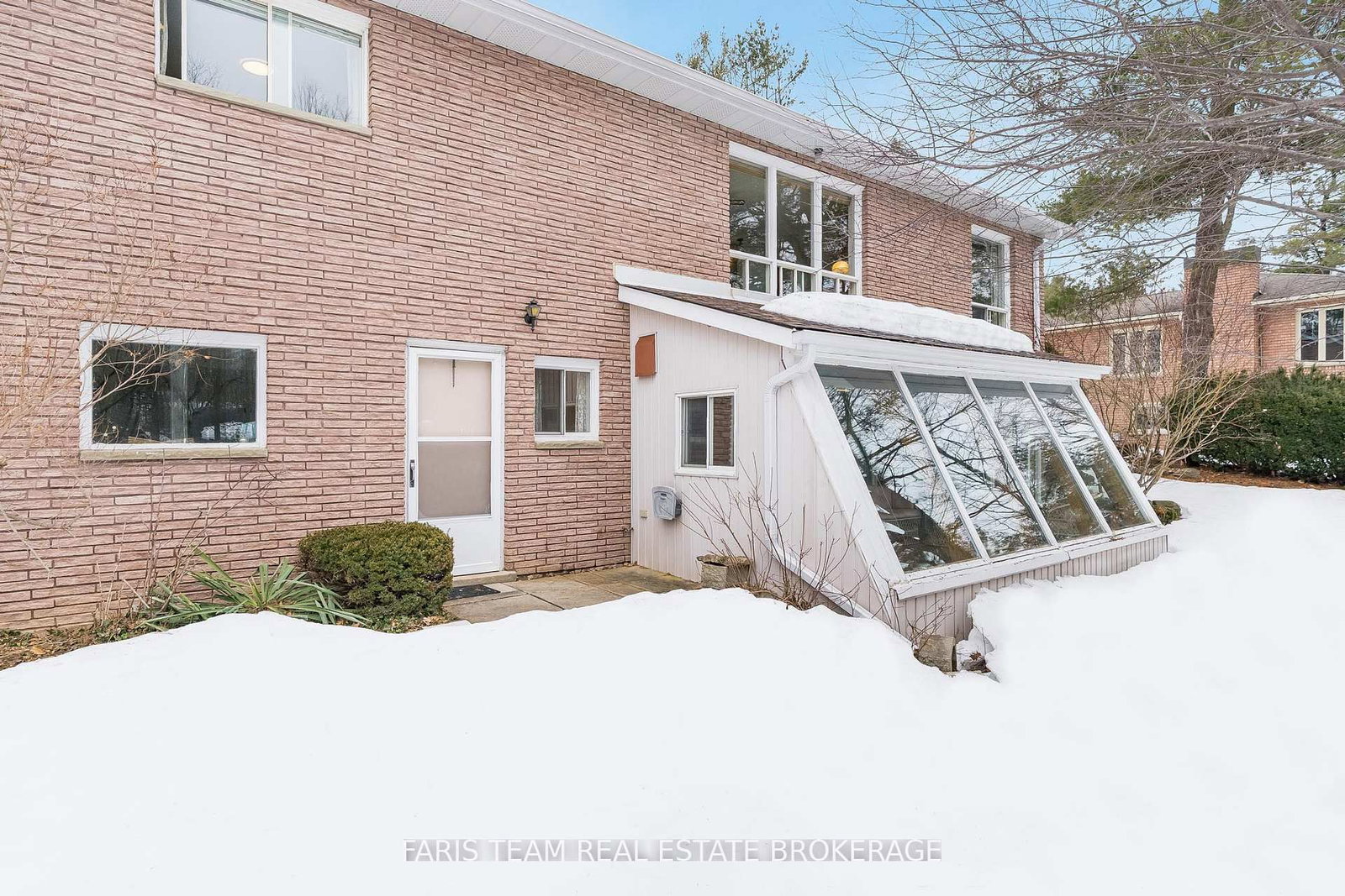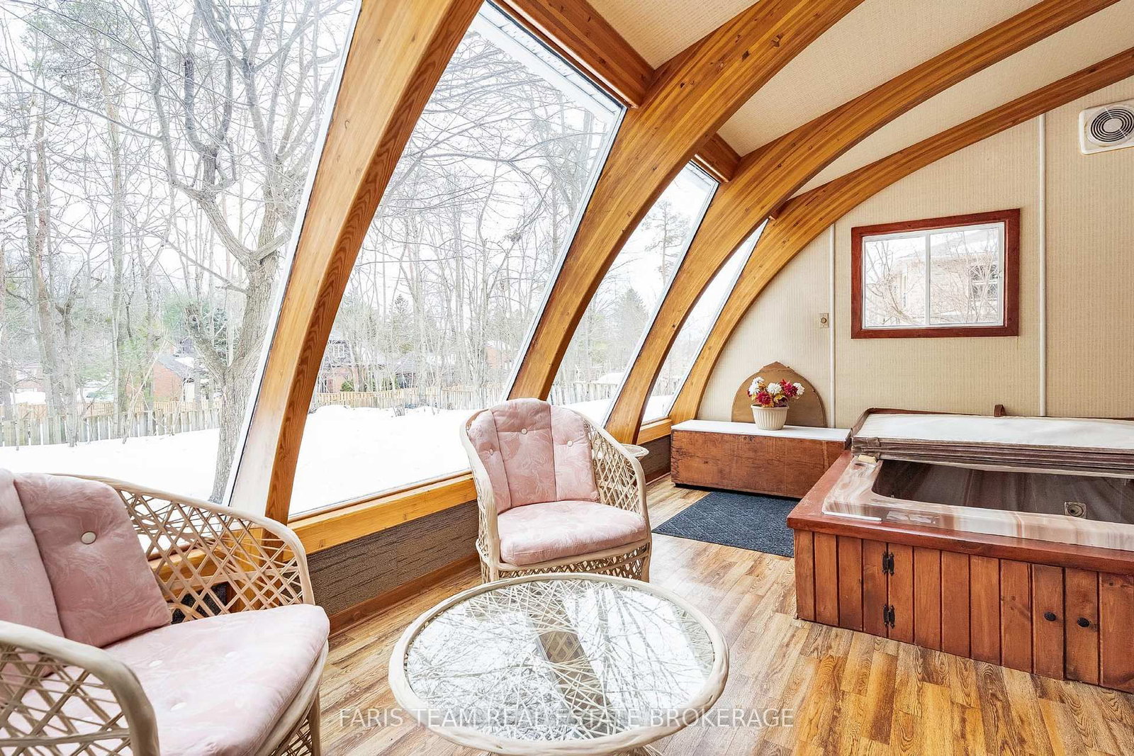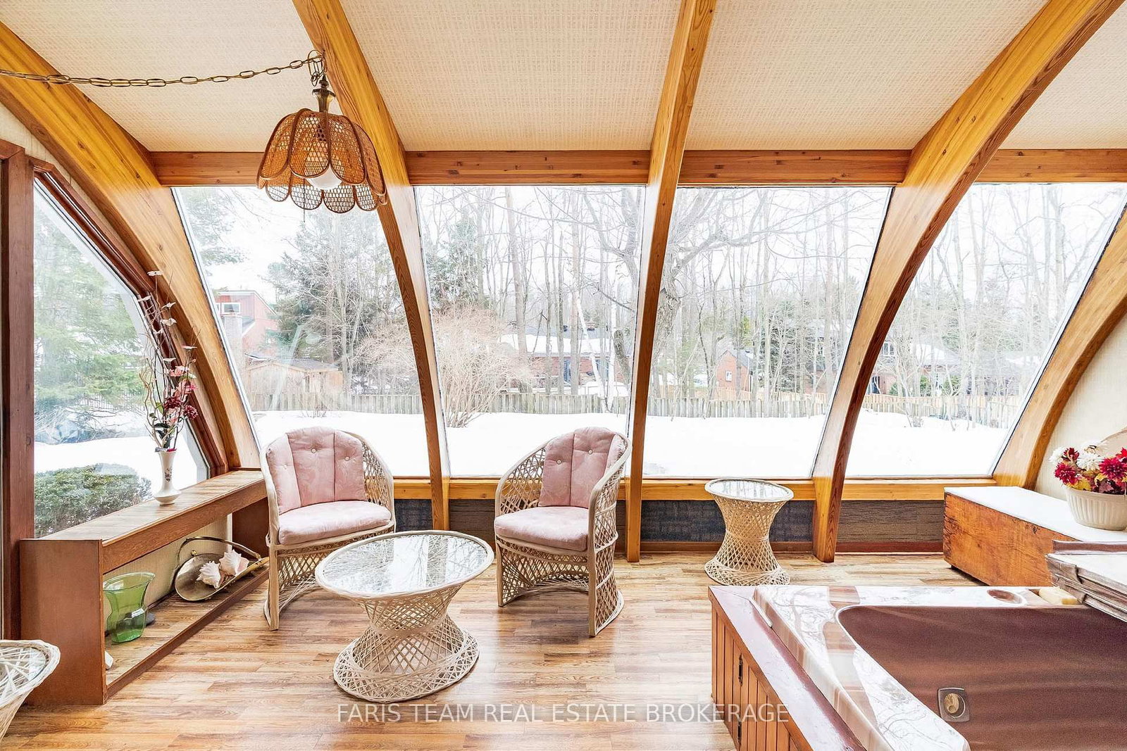 At the back of the home, a sun-filled sunroom accessed through sliding doors from the family room, showcasing warm wood accents and expansive windows that make it the perfect place to relax, even on a cozy rainy afternoon