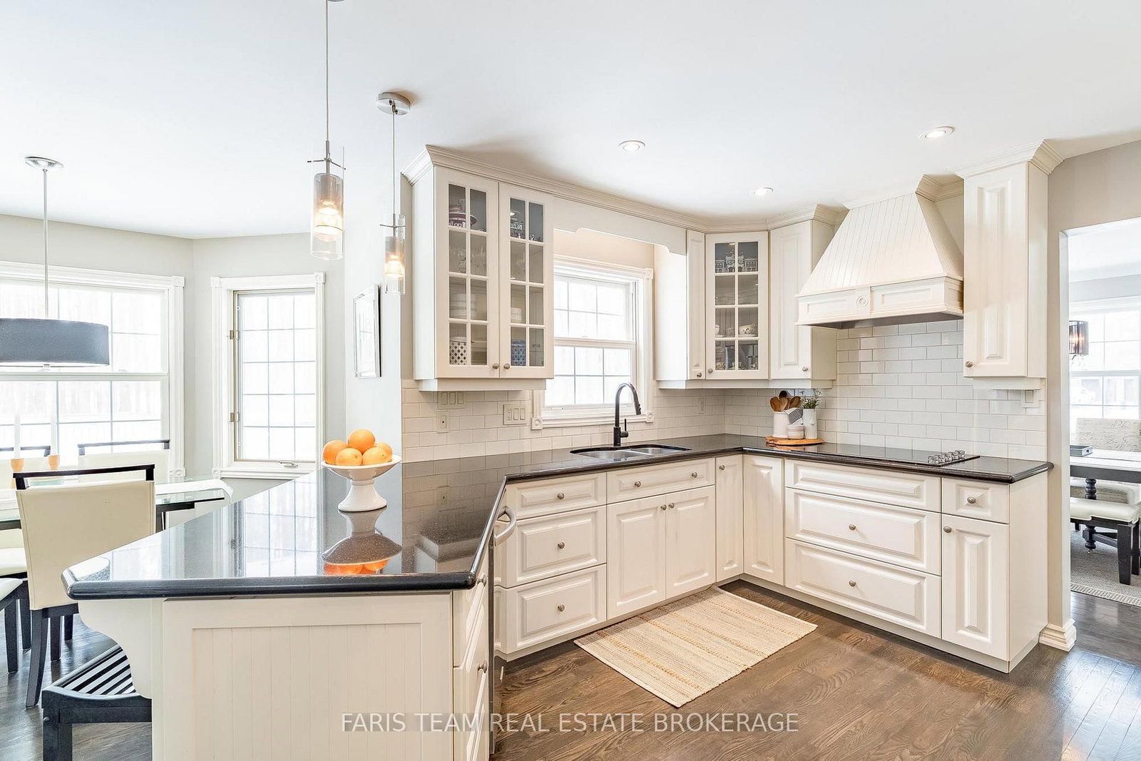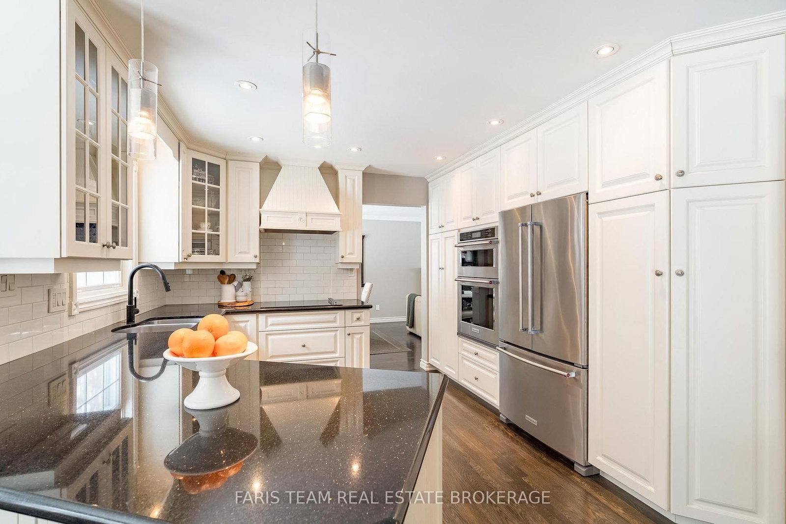Recently updated kitchen equipped with granite countertops, stylish subway tile, and high-end stainless-steel appliances, including a built-in wall oven and a cooktop with a custom hood fan