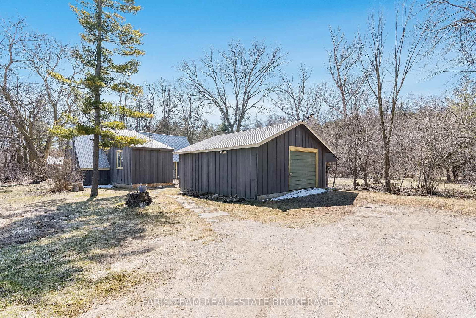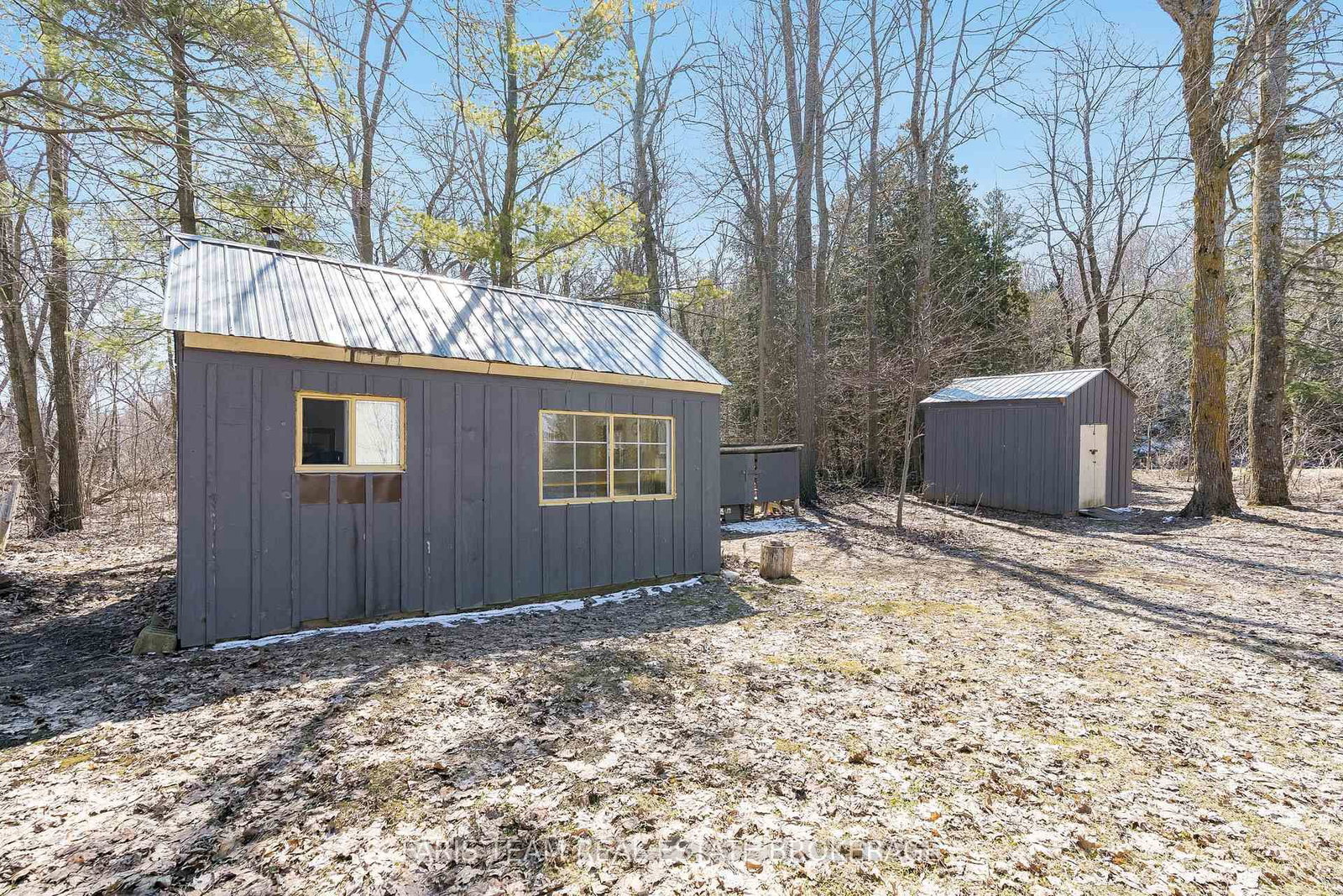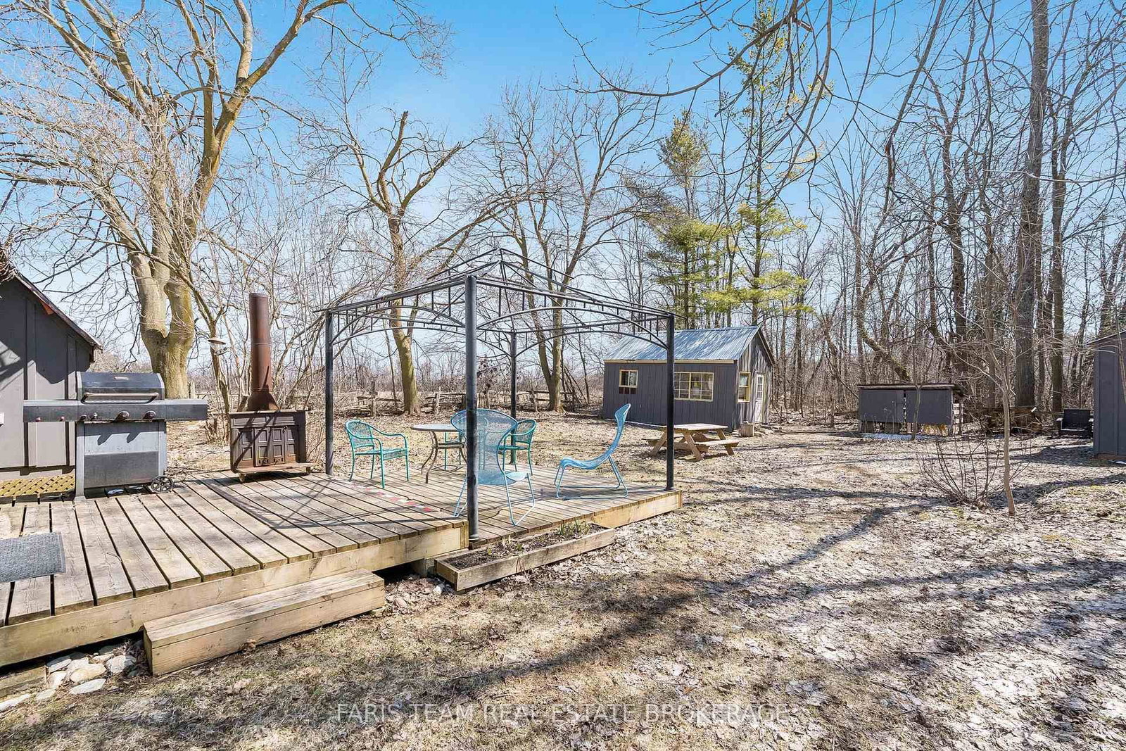 A detached garage provides a full workshop at the front and a powered bunkie at the back, ideal for hosting guests or pursuing hobbies, while a nearby wood shed keeps firewood close at hand for cozy evenings